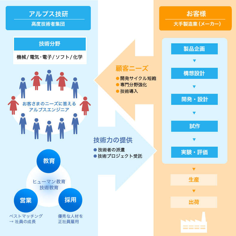アルプス技研はこうしたメーカーのニーズに対し、高度な技術を持った多数のエンジニアを正社員として雇用し、「必要なタイミングで、必要な技術を持ったエンジニアを様々な形態で派遣する」、あるいは「設計・試作・製造・評価を単独または一括でプロジェクトとして受託する」という形態で、技術力を提供。