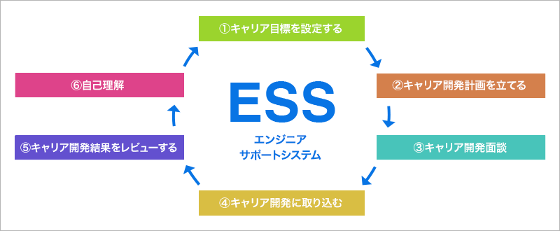 アルプス技研では、一人ひとりの社員が「なりたいエンジニア」になれるよう、様々な研修・教育体系を準備し成長できる機会を準備すると共に、キャリアサポートを徹底しています。中でもESS(エンジニアサポートシステム)という独自のシステムを使い、入社時から継続的にエンジニアのキャリアを支援している点が特徴です。